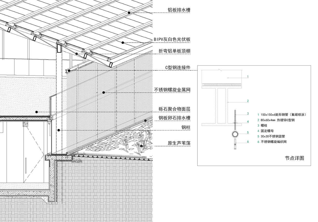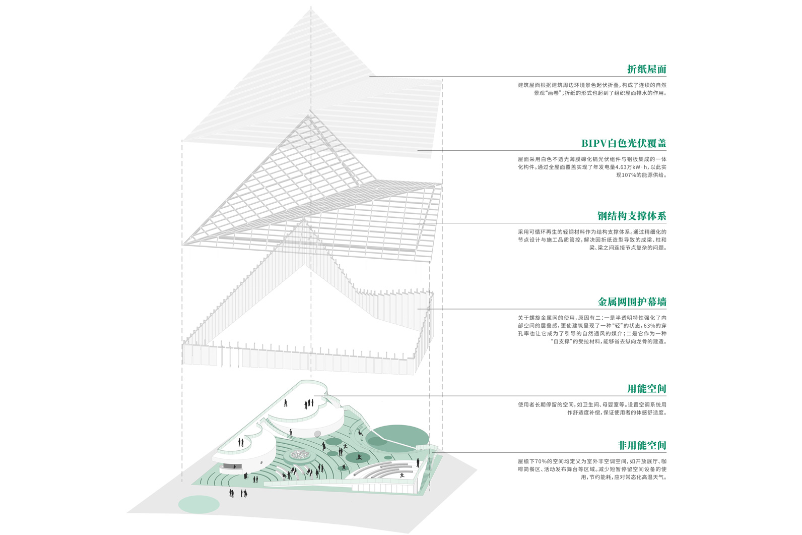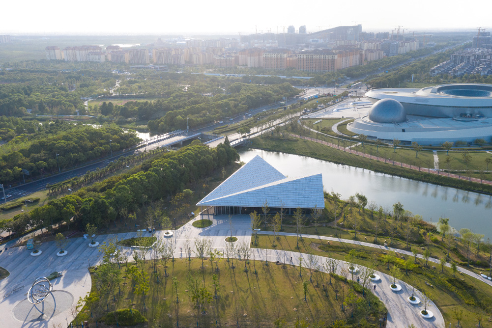 在这个基础上,我们在建筑屋面采用了BIPV光伏一体化系统来产能发电,整个光伏面积将近2000平米,选用了灰白色的光伏组件。设计中,我们对组件的形态、朝向、质感以及效率都做了精准控制,确保既满足建筑全生命周期的能源供给需求,又实现更好的空间与形态效果。让能源产生的载体也同时成为建筑形态塑造的载体。最终,建筑呈现了出“折纸飞机”的视觉印象——这不仅和星空之境主题公园的整体调性契合,也为使用者增添了空间体验的趣味性。