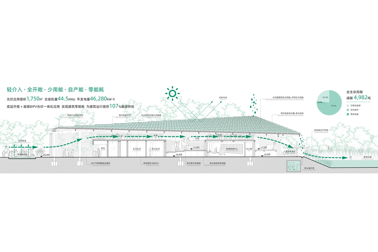 这个项目的设计过程中,我们尝试去探索:在环境介入程度、人的舒适度体验、建筑产能效率以及建筑形态表达这几个维度之间,寻找最佳平衡点。希望能为未来零碳建筑的发展,提供更多来自建筑学层面的实践价值和理论意义。