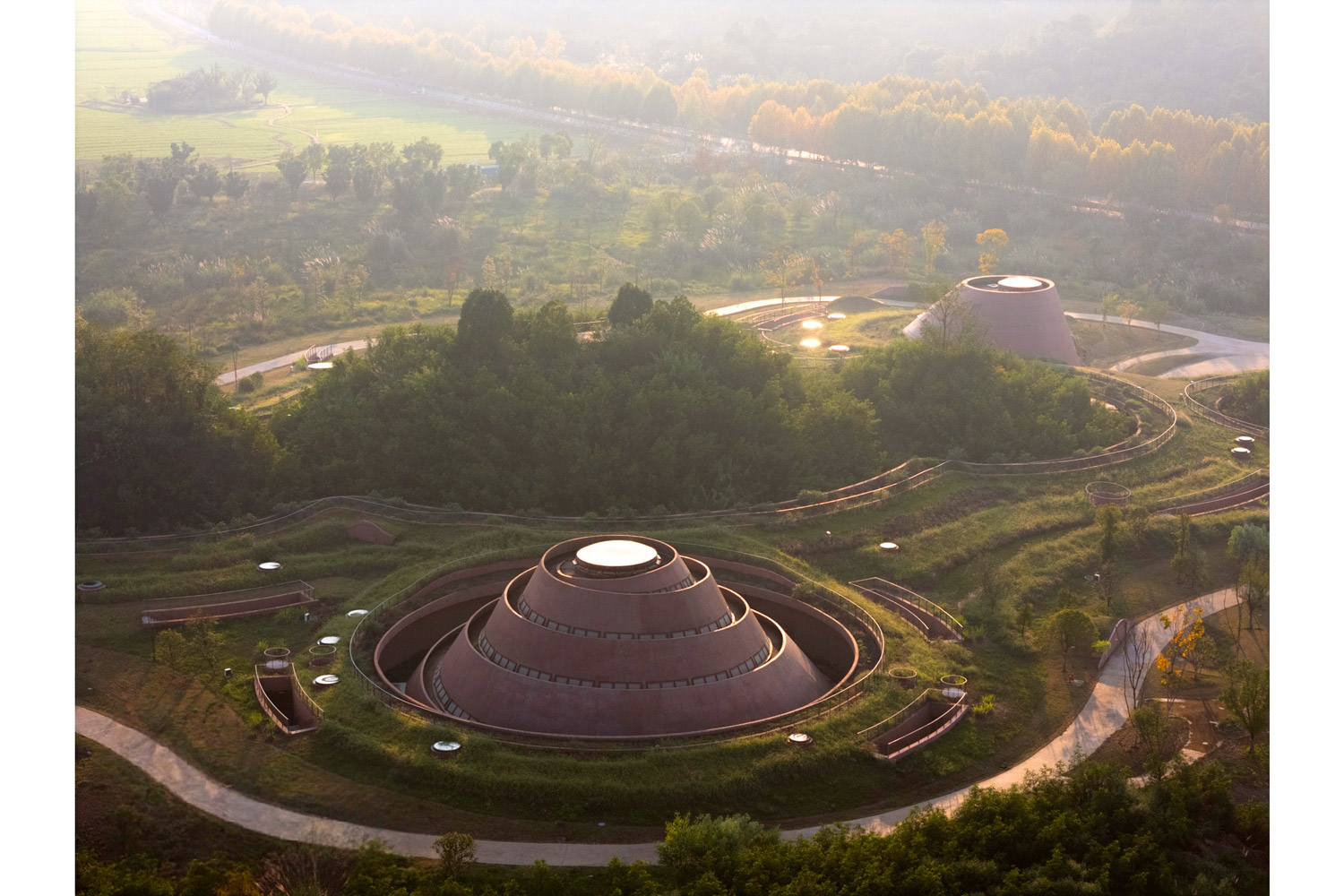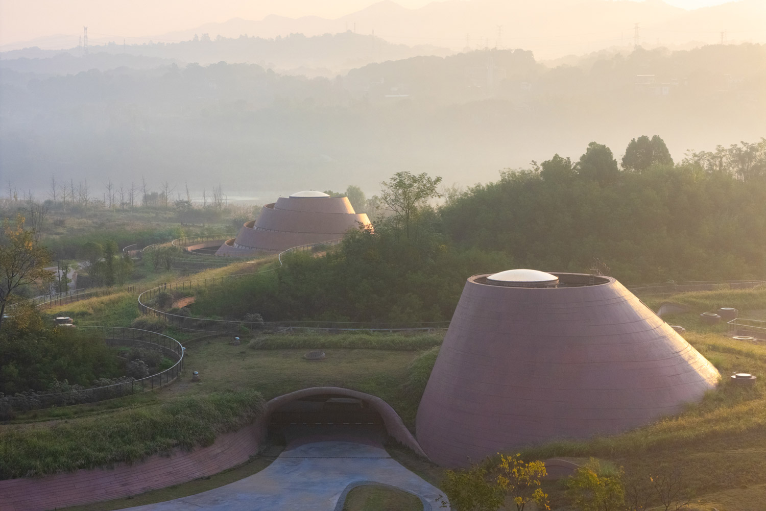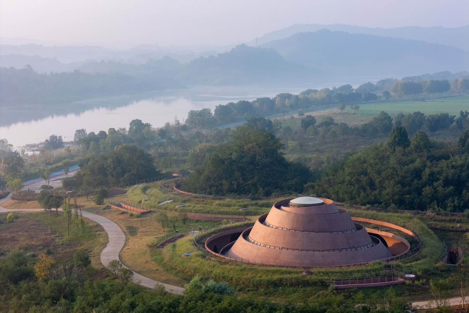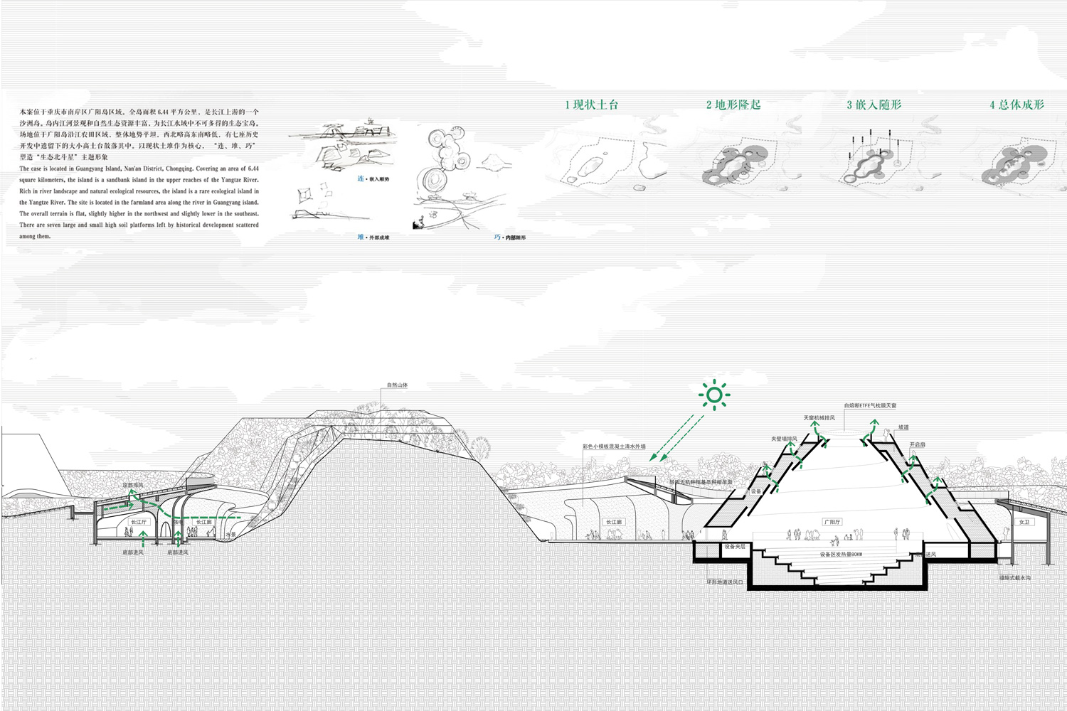 重庆广阳岛大河文明馆借助场地现状“遗痕”展开绿色生态设计,采用一系列科技展陈技术,“起承转合”五大篇章讲述“世界流域文明的兴衰演进大势”、发掘“中华大河文明的传承发展之道”、打造广阳岛成为“长江经济带生态文明的交流展示之眼”。设计立足于重庆本土的气候特点与广阳岛的生态本底特征,项目采用了生态屋面、开放庭院、天井天窗等一系列绿色设计手法,力求做到自然能源与生态资源利用的最大化;建筑布局应紧凑高效,各建设区域主题明确,功能复合,可满足多种不同规格、场景下的功能使用需求;合理配置建设资源,对场地内现存或建造过程中产生的碎石、巨石等进行景观化再利用。