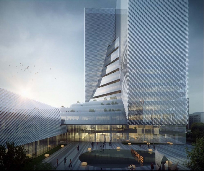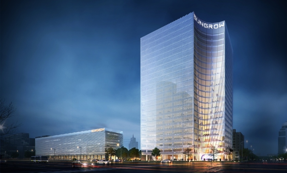 阳光电源企业总部位于安徽省合肥市,建设目标为5A甲级写字楼,打造以展示和利用绿色能源为核心的高科技智能化办公建筑。总建筑面积77682㎡,其中地上58861㎡,地下18821㎡。大厦作为整个企业园区最后一项建设项目,肩负着企业形象展示,完善园区功能的任务。依据总体园区规划,结合与城市道路的关系,将建筑主楼形体设计为“L”型,既将建筑形象向城市充分展示,又将高层办公楼标准层做到经济合理。建筑主楼立面采用斜向百叶,通过智能软件模拟太阳光线运行轨迹,得出合理的百叶倾斜方向及宽度,可营造出舒适的光环境和节能的热环境。大厦朝向园区内部在形体与立面的处理上尽量适宜人的活动与尺度。裙房的通高中庭与形体相呼应,逐层缩小并旋转,营造出有趣的光环境与空间体验。主楼上间隔出现的出挑休息厅,延续裙房的形体趋势,并为办公人员提供了休息厅与空中花园的空间体验。建筑南向维护结构全部采用光伏幕墙,充分展示和利用企业科技,从内到位全方位打造绿色能源为核心的高科技智能化办公建筑。
